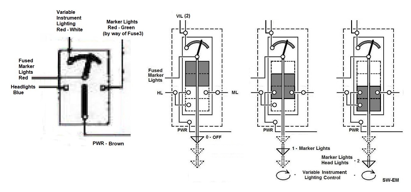 1. Light Switch: The typical published Wiring Diagram shows an oversimplified switch, with Power input terminal connected to a contact arm which connects to EITHER Marker Lights (switched to the right) OR Headlights (switched to the left), suggesting this is a Single Pole, 3 Throw (SP3T) switch. That is clearly incorrect. The correct representation is sequential as shown here on the right, applying power to Marker Lights in position 1, and Markers AND Headlight (Mainbeams) in Position 2.