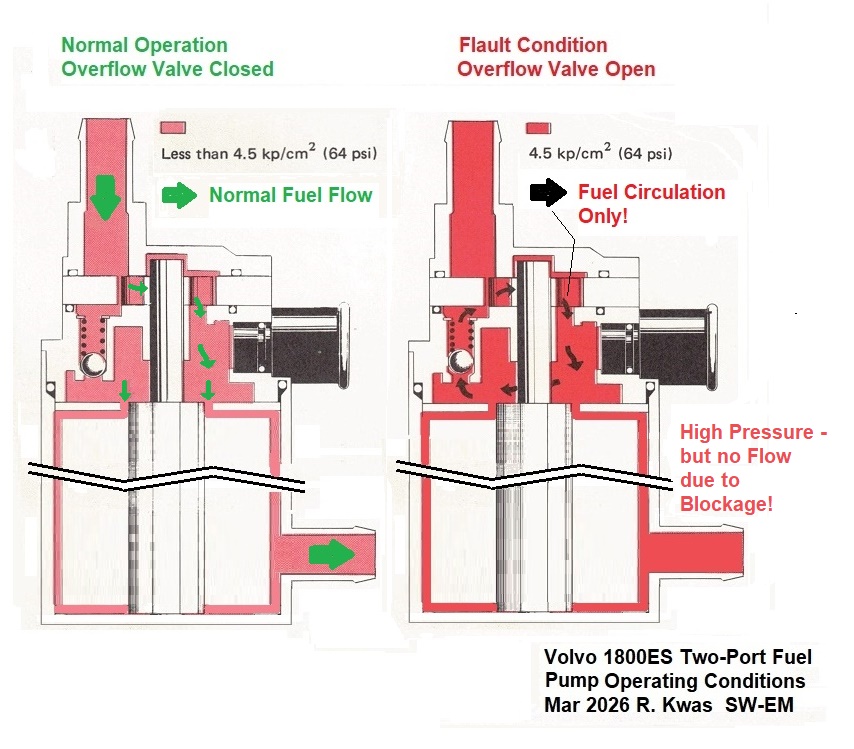 Late Production Two-Port (Wet Motor) Fuel Pump info based on diagram as shown in the 1973 1800ES Factory Service Manual. It can be seen here that the Overflow Valve flow occurs internally and does not flow by way of a third port, and external plumbing. The pressure sensing Overflow Valve is simply located between inflow and outflow of the pump in the housing, so that when a blockage situation occurs downstream, causing pressure to rise and exceed the Overflow Valve's 64PSI / 4.5kp/cm2 rating, it causes the Valve to open and the fuel then simply circulates inside the pump housing. Again, this will likely be accompanied by Fuel Pump Noises, unusual to the driver, and other engine running abnormalities, if the driver takes no notice of the noises...