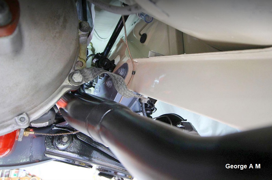 Picture of absolute first quality restoration work as is typical, by George A. Minassian in Australia, and used with his kind permission. (View forward along exhaust downpipe, from below an 1800). The braided cable is clearly evident, tying chassis and Engine/Bell Housing together, ready to pass high current and not mind constant vibration! A little loop holds it clear of the exhaust.