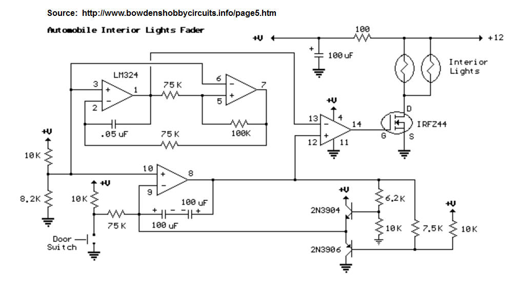 The top two opamps (pins 1,2,3 and 5,6,7) form a triangle wave oscillator running at about 700Hz while the lower opamp (pins 8,9,10) produces a linear, 5 second ramp, that moves up or down depending on the position of the door switch. The two transistors and associated resistors serve to limit the ramp voltage to slightly more and less than the upper and lower limits of the triangle waveform. These two signals (700 hZ. triangle wave and 5 second ramp) are applied to the inputs of the 4th opamp (pins 12,13,14) that serves as a voltage comparator and generates a varying duty cycle square wave that controls the IRFZ44 MOSFET and lamp brightness. The 5 second fade time can be adjusted with the 75K resistor connected to the door switch. A larger value will increase the time and a smaller value will speed it up.