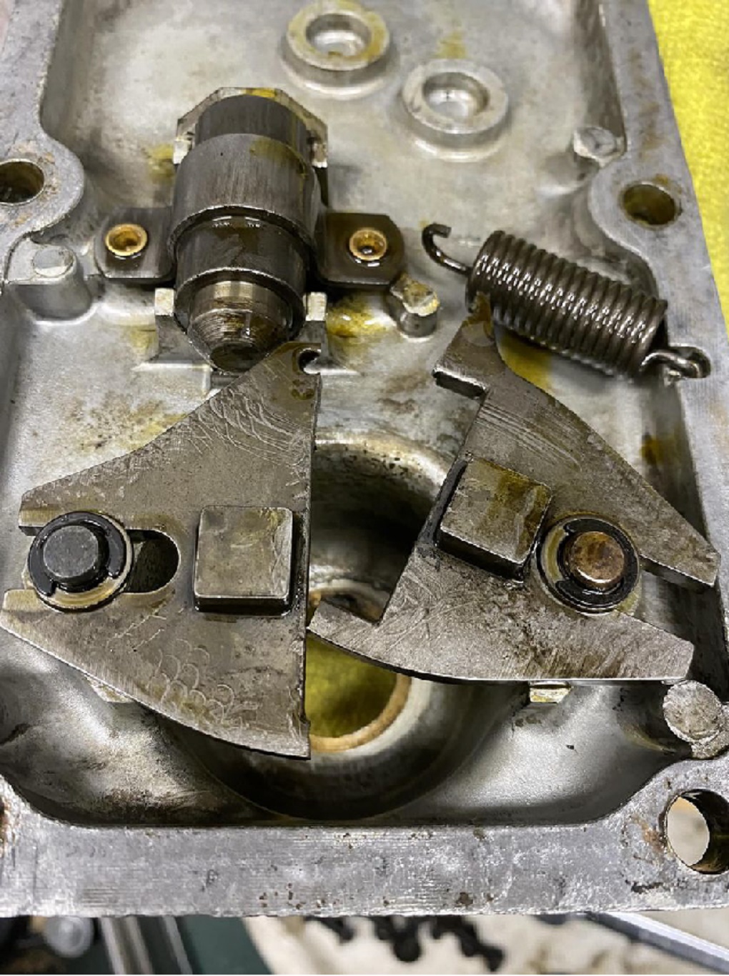 Underside of a Gearbox Cover with broken Interlock Plate.