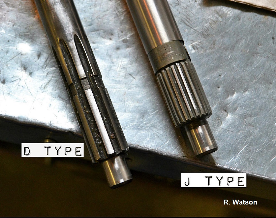 Splined Output Shaft (which is also the extended, main Clustershaft of the gearbox) of the M41, intended for the D-Type OD, has completely different splining, and so is very different from the Clustershaft of the M41 intended for the J-Type OD. D-type and J type ODs therefore cannot simply interchange.