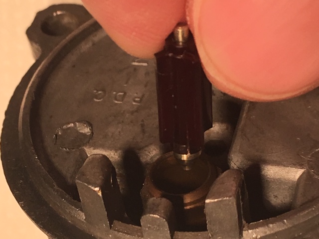 Inspection Item 3: Check metering needle for contact damage. Inspection should be performed under a good light-source! If contact has occurred for any reason between the brass Metering Needle and jet, the soft brass will show scratches or worse. This will probably result in taking material away, resulting in enrichening at idle and possibly higher RPMs. No contact and no scratching or changing the needle dimensions in any way is preferred, some light sign of contact may be evident (without scratching or insult to the surface), but if excessive or clear indications of scratching or changes to the MN surface or dimensions are evident, replacing the needle with an identical one (labeled on side of base with a two letter code, i.e. KD, ZH) is about the only option.