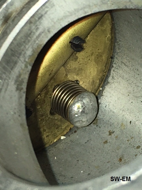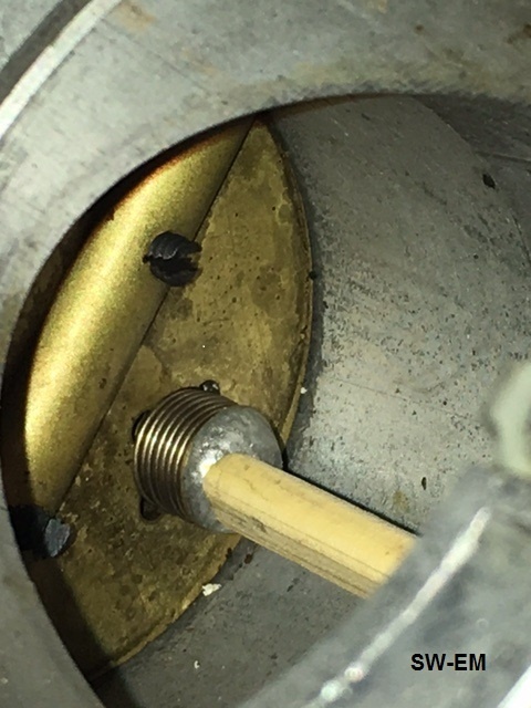 TOV viewed from above (through Dashpot opening) so that TOV spring is well visible. | TOV depressed with an soft wooden tool. Movement is only about 0.10" and should be along axis of spring (not askew, in which case, it may jam open! **) |