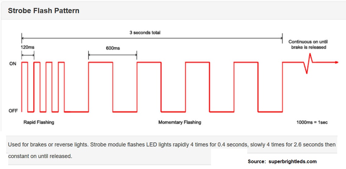 ...and if we have installed LED Taillight elements in part to improve our visual signature to those looking and paying attention, here is an interesting option to add for those maybe not looking and paying attention, which will help to capture their attention: An ON Strobe! Some readers may have noticed these on various vehicles...I have on ambulances and other first responder vehicles (which don't really need them, since they have other strobes and a blaring siren to help themselves get noticed!). These circuit modules take advantage of the instant ON response of LEDs to rapidly pulse these a few times, before switching them ON continuously (I don't think they would work with incandescents, which are too slow to respond!). Although some municipalities may not allow them, and they can be borderline obnoxious if you're stuck behind someone with them in a traffic jam, but this is another level of drawing attention to oneself, and which (maybe) compensates just a little for the diminutive Taillight size!