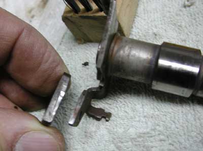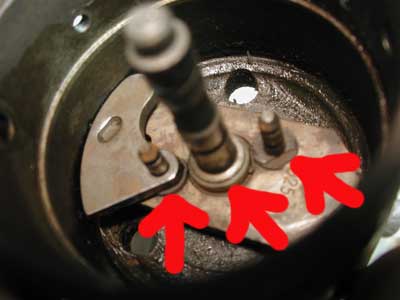Centrifugal Advance In the case of the centrifugal system, it is a bit more subtle...centrifugal weights below the points plate, their rpm dependent force working against Primary and Secondary Springs, vary the relative position of the stacked concentric shafts of the distributor. Clearly, it is not possible to accurately check this action when motor is not running, but by turning an installed rotor, CW about 20 degrees, one can get a pretty good general idea of the state of the CA mechanism. A smooth rising return force action against the springs should be felt, returning to the non-advanced position when released (any step or binding, or non-smooth action is a sign of problems which can cause erratic engine surging while driving). I have seen wear of the centrifugal weight assembly (on a number of different distributors), which resulted in the centrifugal weights not moving smoothly, but this will take another specific section to cover. See: Detailed CA Servicing.