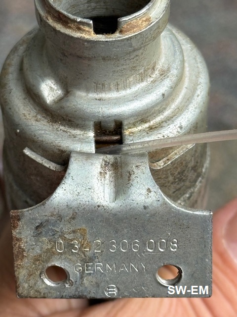Ignition Switch, Frontview (Lock Cylinder removed, slot with central Compression Spring for Tailpiece is visible). It is against the counter-force from this CS, that the LC Tailpiece is inserted. The CS is NOT the Gorilla Spring which causes Ign Key fatigue and breakage!