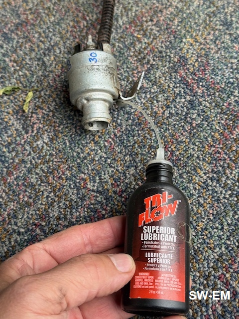 Note: Access is NOT by way of the Lock Cylinder (there is NO direct path!), but into a hole at 6 O'Clock position in front of housing next to the mounting flange, which is quite hidden when installed, and accessible only with difficulty from behind the Dashboard, and only then, with a strategically guided snoozle [but there's nothing wrong with lubing the Ign Sw when it's installed either!]...it's worlds simpler to do the lubrication step when assy is in ones hand and access is good!