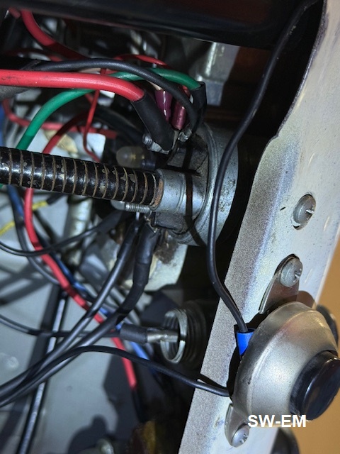 Replacement Ign Assy is in place, wired, and ready for installation of new Lock Cylinder (also pre-lubed of course!). Visible is a non-OE horn button, added because the OE Horn Switch is non-functional...I guess the Steering Wheel Hornswitch needs some attention too...! This is covered here: 122 Horn Switch Repair