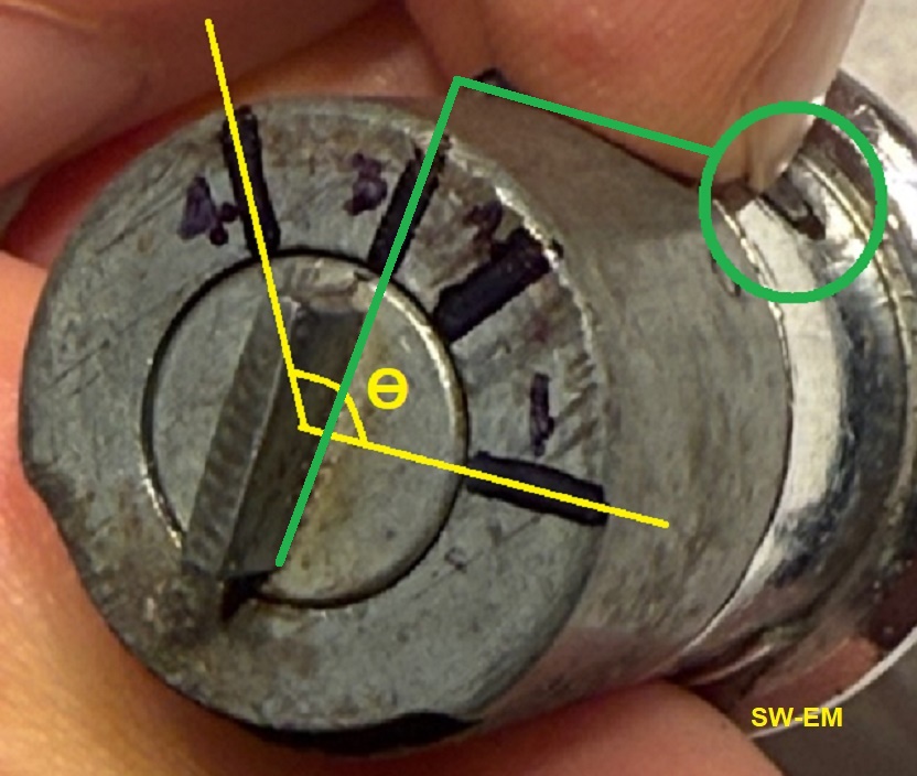 Rearview of Lock Cylinder with Tailpiece angle marked with respect to Key position. Ign Key is inserted (in Pos2) and turned to Pos3 allowing Retention Pin to be depressed. Note the total Key swept displacement is 90º,while the LC Tailpiece sweeps through 135º! This "gearing" is a big contributing factor to the key fatigue issue as discussed here: LINK
