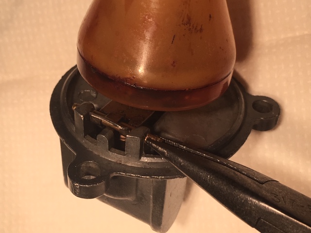 Once the Dashpot and Dome assembly are secured in place on the carb body, repeat the previous test for smooth Dashpot travel, verifying that Dashpot bottoms out completely on the bridge with a clunk. The Dashpot will follow a finger directly, without the damping valve installed. If good alignment and smooth motion is verified, install damping valve by inserting (brass) valve into Dome and Dashpot tube, pushing it down and into the ATF, finally snugging it handtight only (Beware: Overtightening or tightening with a wrench will surely break the threaded Bakelite part...DON'T DO IT!). The fiber washer limits the tightening force and gives some locking action against the vibration present in operation.