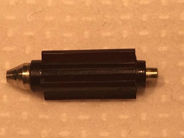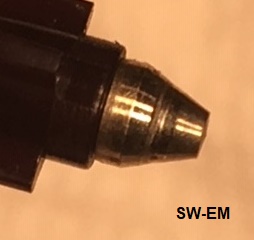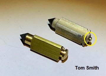 Inspection Item 3: Check metering needle for contact damage. Inspection should be performed under a good light-source! If contact has occurred for any reason between the brass Metering Needle and jet, the soft brass will show scratches or worse. This will probably result in taking material away, resulting in enrichening at idle and possibly higher RPMs. No contact and no scratching or changing the needle dimensions in any way is preferred, some light sign of contact may be evident (without scratching or insult to the surface), but if excessive or clear indications of scratching or changes to the MN surface or dimensions are evident, replacing the needle with an identical one (labeled on side of base with a two letter code, i.e. KD, ZH) is about the only option.