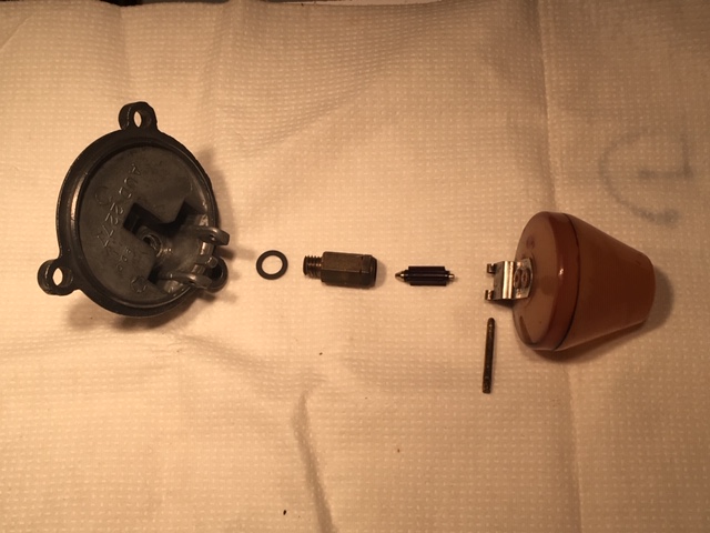 Check of Fuelbowl Valve Shuttle and Seat Valve is actuated by action of float. Remove the pin on which the float pivots, by gentle back and forth rotation with needle-nose pliers while pulling. Pins typically have a flattened area which means they can only be installed from one direction, removed by backing it out. Once the pin is removed, the float can also be removed. As the float is removed, valve shuttle can fall from the Valvebody, so care should be exercised not to loose this part (hold with Valvebody horizontal!). Several different types and styles were produced and may be found during disassembly. Using a magnifying glass, inspect condition of conical seal area form wear or damage. Replace if either are observed. With a light, inspect the ID of Bowlvalve body for debris or gum or varnish fuel deposits which may cause Shuttle to stick in place. See Disassembly of Bowl Lid below. ID should be perfectly clean...see You Tube Link below for a good technique to get it that way.