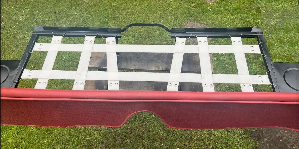 An 1800 seatback which has been previously reworked using a burlap type webbing