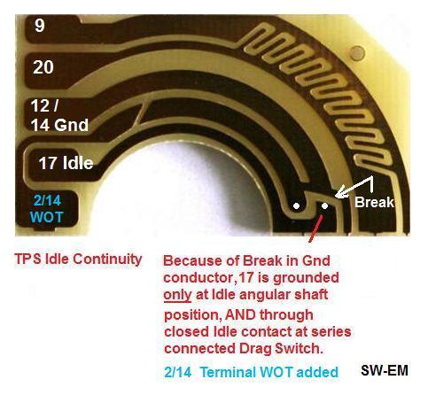 Throttle Closing / Shaft Rotation CW. Throttle shaft is in Idle Position, contacting Post, but Terminal 17 is connected to chassis ONLY when at end stop due to Conductor position on PCB and break in conductor (Reference: PCB Detail below).