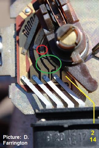 The Drag Switch consists of a spring copper contact riveted with a gold/brass(?) rivet, to the fixed end of Wiping Contact No1 (TVS term 14), which contacts one of two gold posts, each riveted with a gold/brass(?) rivet, to the fixed end of Wiping Contacts 2, and 3 respectively (copper on gold, no wiping action!). Separation of Drag Switch contact in the post area is smaller than the separation of contact Posts, resulting in a dead zone where Drag Switch contact is between the two and not contacting either. PLACEHOLDER: for angular measurement of degrees of Throttle shaft rotation associated with breaking contact to one of the Comb Contacts, to contact to the next.