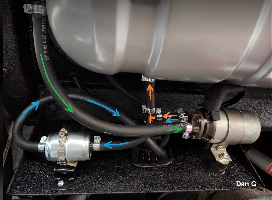 Dan G provided this nice clean picture of his '71 1800E with a replacement Tank*, showing the feed (Green) to the (3 Port) FuPu from the side, FuPu outfllow (Blue) to FuFi and beyond, and the bypass outflow from Pump into "T" fitting (Orn) , joining the Fuel Press Reg Return from engine compartment (which is obscured).