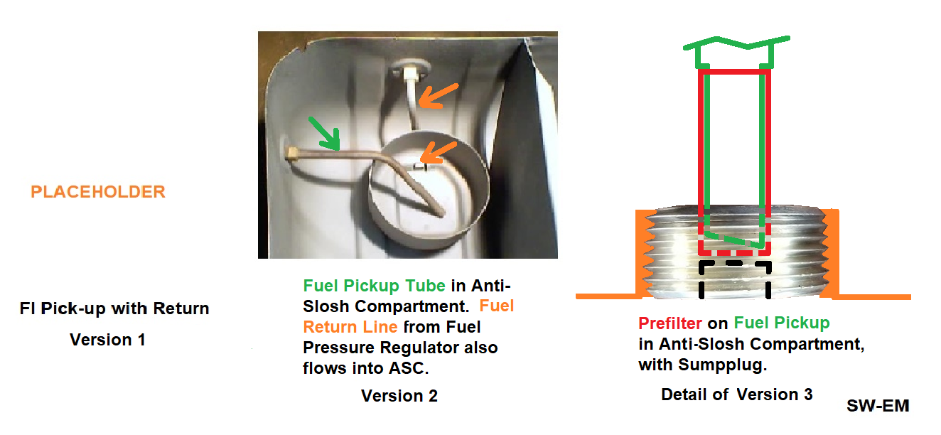 Versions of Tanks for Injected Models, internal Tank configurations got more complicated, with the addition of the Fuel Return Line from the Fuel Pressure Regulator, an Anti-Slosh Compartment and on the last models a Prefilter with Sump.  Versions 1-3 known to the author are shown here (if the reader can help with internal pictures of various configurations of OE Tanks, please e-mail!):