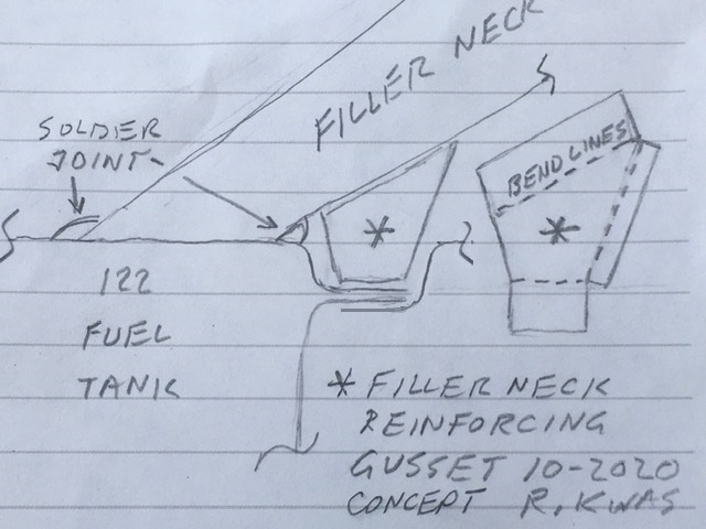 If you cannot solder (for which tank must be COMPLETELY empty and vented, or baked in the sun until no more strong fuel smell confirms non-flammability!), OR you don't want to remove Tank, you can temporarily seal fuel leaks with fuel compatible (silicon) RTV (like Dow-Corning 730 Fluorosilicon formulation, NOT 732 general purpose [which is not hydrocarbon compatible!]) ...until it can be repaired right...but again, I highly recommend installing strengthening gussets to support filler neck or this condition can easily return!  There's not a lot of room, but enough...see below for a sketch of what I installed last time my Tank was out.  "