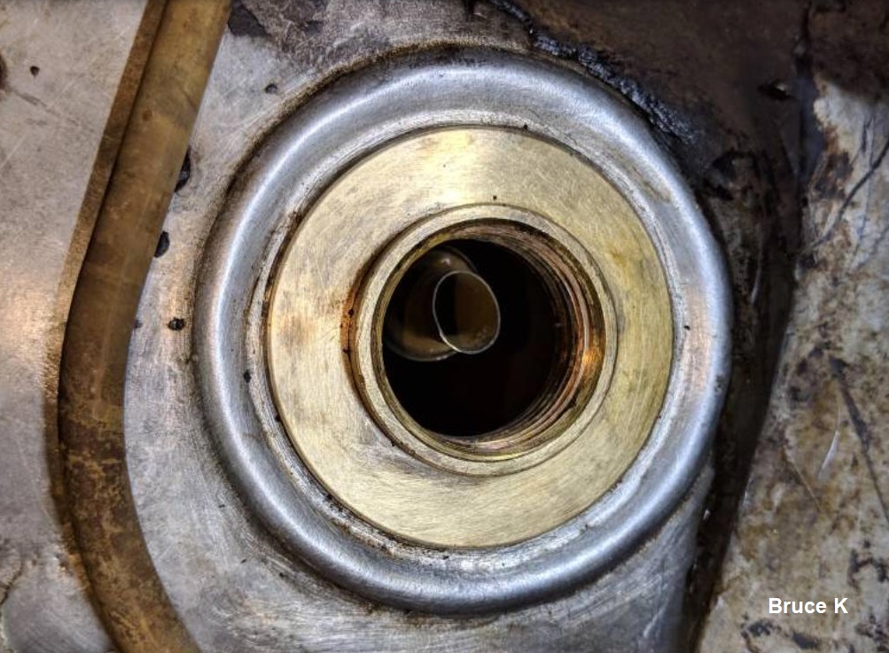 Version 3.  Pic of a cleaned the '73 ES (Version 3) Sump with Plug removed, so that angle-cut Pickup Tube with shoulder-stop for the Prefilter and soldered-in brass Sump fitting are all nicely discernable.  Picture by Bruce K. and reposted with his kind permission.