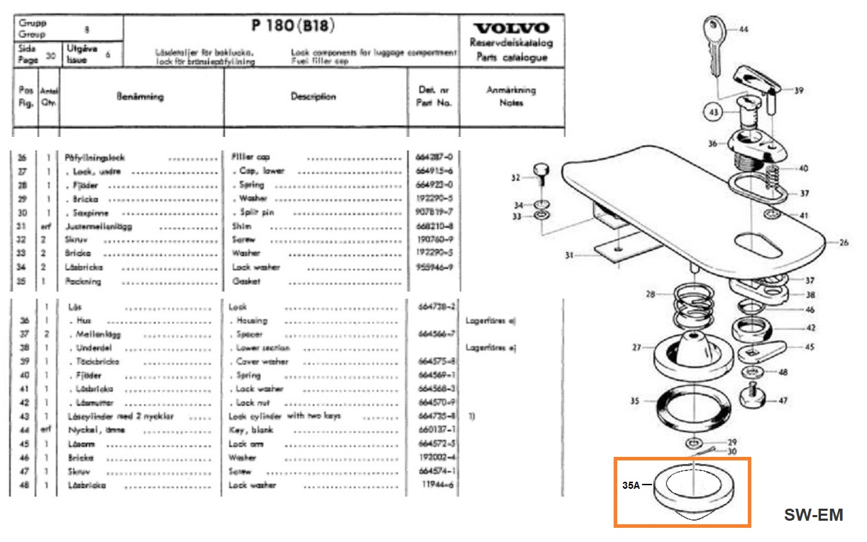 I have amended Volvo's Exploded Assembly Diagram below, and added the cupped Rubber Seal(35A) as it should be located and be installed...by gluing it, cup down, onto the flat area of the Metal Cup(27)!  The Metal Cup is assembled, cup up FIRST, with Washer(29) and Cotter Pin(30) holding it in place on the Pin which extends down from the hinged Fuel Compartment Door [Cap(26)], THEN, the Rubber Seal is glued in place.