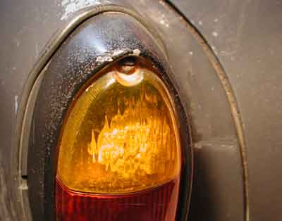 During warm weather on the other hand, mean, flying, stinging insects can often be a real problem, and these squatters tend to be a lot more "territorial", insisting that they now own the car! I've found, that just about any type of carb cleaner (quite probably on hand!), is instantly effective against all but a huge colony if the element of surprise is on our side (use the snoozle to increase long-range accuracy). Initially, a few minutes of careful surveillance of the vehicle, even if stored inside, will usually reveal if insects are present...and note, the longer a vehicle was stored, the better the chances it is occupied! Below is an interesting location for one of these colonies. Usually, insects prefer to locate their nests under the vehicle or in fender or door crevasses...apparently these guys preferred to also see the world though "rose (or in this case, amber) colored glasses".