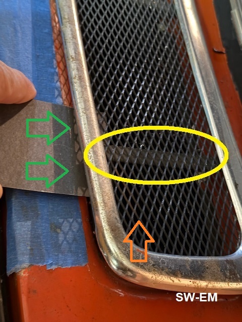 Alternately to the taped putty knife, the body along the front of Cowl-Surround and Grill has been taped for protection.  A piece of thin, flat, stiff resin filled board ("Fish-Paper"), is pictured here, being slipped under the Cowl-Surround in the area of the near-side, front Retention Clips, and used to gently push them away from the Cowl-opening edge, while lifting up to defeat them.  As progress is made, the shim can be moved to the center Clip to continue the progress, and finally to the far clip.  REPEATING:  DO NOT BEND OR DEFORM THE GRILL-SURROUND!