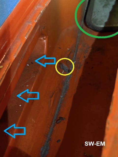 Below are pictures of this second drainage provision in the Heater Core Enclosure, as well as likely results of it not working as intended.  Rust in bottom of enclosure suggests rainwater drainage was impaired (pooled Coolant would have the telltale green color and likely not have rusted as it contains anti-corrosives), allowing standing rainwater to pool, and rust the inside of enclosure, likely also spilling over onto the cabin floor as it reached the level of air vent (oval opening), as it appears to have done.