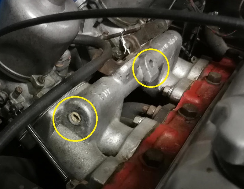 Support (not visible below) in addition to the Manifold, for the overhanging mass of side-draft carbs, is highly recommended!