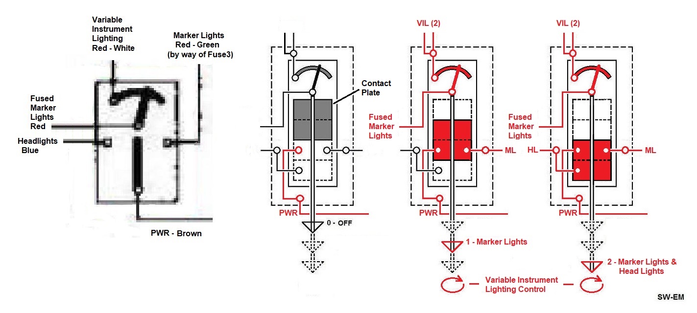 1. Light Switch: The typical published Wiring Diagram shows an oversimplified switch, with Power input terminal connected to a contact arm which connects to EITHER Marker Lights (switched to the right) OR Headlights (switched to the left), suggesting this is a Single Pole, 3 Throw (SP3T) switch. That is clearly incorrect. The correct representation is sequential as shown here on the right, applying power to Marker Lights in position 1, and Markers AND Headlight (Mainbeams) in Position 2.