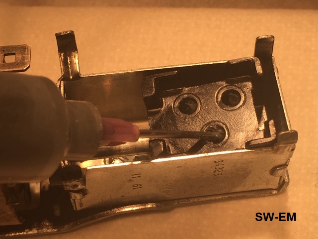 Bottom-Cover of switch is placed in position, compressing contact springs, and temporarily held in-place with a wire-tie, allowing the switch to be test-cycled and checked. Once satisfied with the mechanical switch action, tabs securing Bottom Plate in place are gently bent back into place to hold the assembly together.