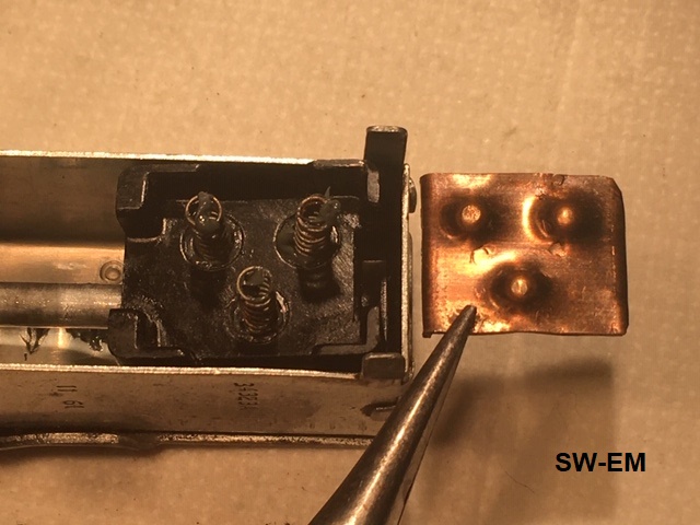 Three Springs have been returned to their holes in the Shuttle. Formed copper Contact-plate is held next to its final location in the assembly.