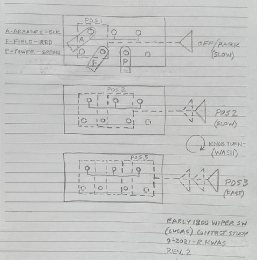 Background: On the Volvo factory wiring diagrams of early (carbureted) 1800, the internal switching shown for Lights, Wipers and Fan switches is just plain wrong, showing in each case oversimplified connections which don’t allow for the sequential nature of each of these multi-position pull switches.