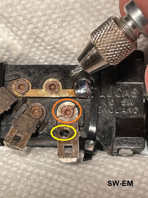 Riveted terminals are cleaned up up with a homemade Micro-Wirebrush (a mini-collet
