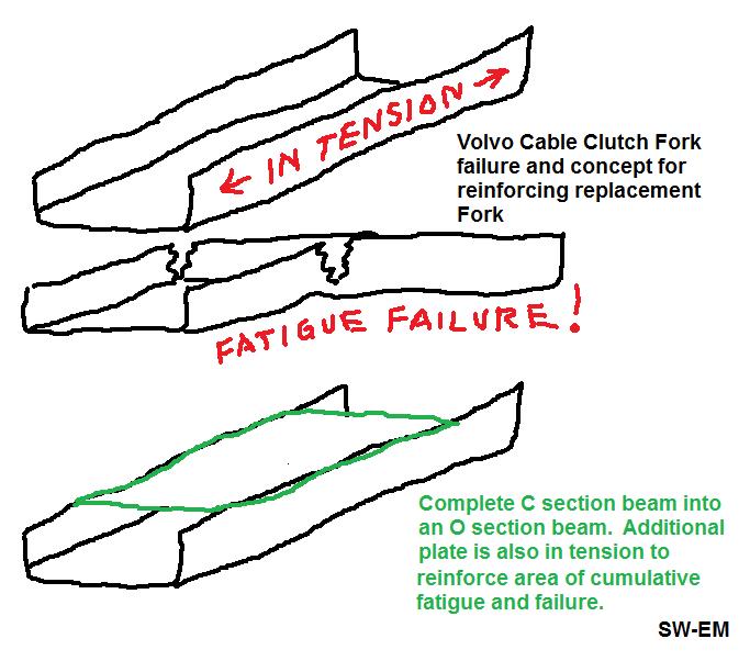 The original Fork may develop fractures after long-term service. These fractures can develop at the Stress Riser located at a corner in the Fork needed to clear the Bellhousing (or anywhere along the stressed area, see below!) . A combination of the corner being too sharp, the material being too thin, and working against the repeated counter force of the Pressure Plate, means the formed sheetmetal Forks of the early design suffers from Cumulative Material Fatigue.