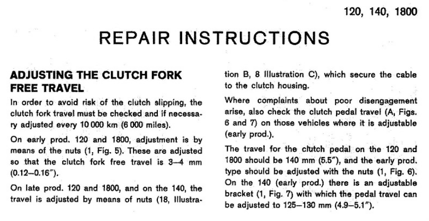 Background: Late 120 and 1800 as well as all 140 models replaced the earlier Hydraulically (push) activated Clutch mechanism with a Cable (pull) mechanism. While this got rid of the hydraulic system, where leaks or failed seals may have been perceived as a weakness (with a failure, driver would loose Clutch control), it replaced this with a mechanically actuated Cutch system that was not without weaknesses of its own (a failed Clutch Cable would instantly also loose Clutch control). And early versions of the Clutch Throwout Fork are known to develop a cumulative stress fault which also resulted in a somewhat slower, but nonetheless loss of Clutch control, (failure was not instantaneous and symptoms gave some warning)...the ultimate failure of either system would instantly render the Clutch Pedal into a footrest, so there is really not much difference in the failure modes.