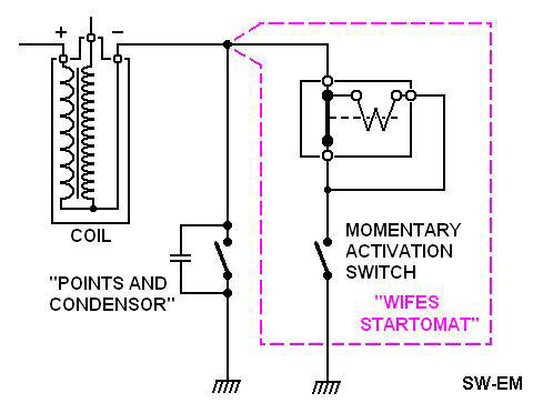 Wifes Startomat Circuit (from the: Neat Idea Department): The clever designers of the circuit recognized the fact that one and only one discharge of the Ignition coil primary, accompanied by a single high voltage spark occurred per opening of the points. This is a valid weakness at cranking RPMs because that one spark is only one attempt (and opportunity) to ignite the mixture. If this single attempt is unsuccessful…tough luck!...there’s no second chance on that cylinder, and the starter motor will need to continue to crank to the next cylinder’s firing point and give that cylinder a chance. It’s a one-shot, one bullet approach…