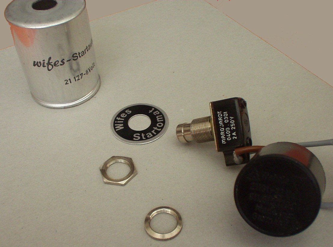 The device consists of cylindrical aluminum housing with a momentary pushbutton. Two wires exit the housing. Upon disassembly, here is what Robby found: A switch and relay! The Wifes Startomat was to be wired from the points node to ground and the push-button activated during starting attempts. A 6V rating is printed on the side of the can under the unique name. The question is: How can this possibly do anything to help starting?