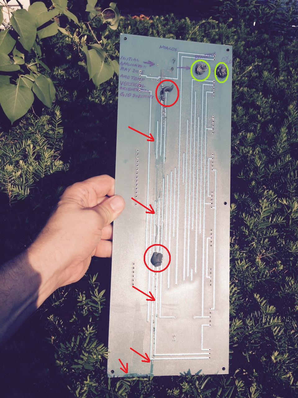 Test consisted of placing a .5ccm testblob of the ACZP of three manufacturers*, on an inert, vertical, test substrate (G10 circuit board with solder-mask [epoxy] surface treatment) as might be encountered in actual use. Two test surfaces were prepared and exposed to two different temperature conditions. Sample 1 was left at relatively constant ambient temperatures of approx. 60ºF (the embassy cellar!), simulating application on an electrical panel. Sample 2 was exposed to temperature cycling from approx. 60ºF to 120ºF (the embassy attic!...where temperatures cycle wildly from night and day in the summer, but nowhere near as high as engine compartment temps!) simulating application in a less-than-maximum-temperature engine compartment. Sample 3 was installed in an Engine compartment, to experience the worst-case environmental conditions occurring there...test is on-going!