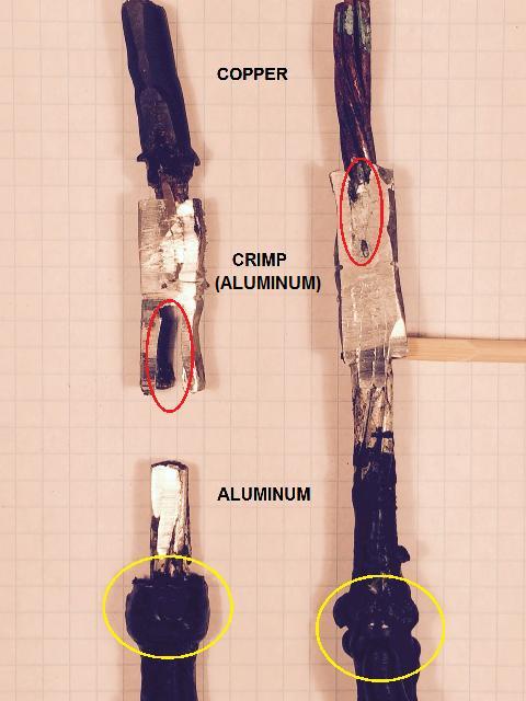 After the nice serviceman replaced both crimps (with clamps), I asked him for the old ones in order to perform a dissection and post-mortem (I expect not many customers do that, but inquisitive minds need to investigate these things!). When I cut them open at the Embassy-Technology Testing Center, what I found was no major surprise (to me)...corrosion had done its dirty work, and the insides (of both!) were filled with white and black aluminum oxides (both non-conductive!, see pictures and Reference information, Excerpt from Framatome Connectors International below), and insulation on both showed unmistakable signs of having been hot to the point of partially melting!.
