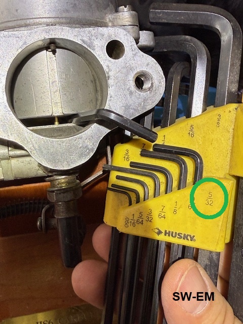 A practical test in which hexwrenches were tested for fit into the clearance above the Venturi when the LP is activated, shows that a 5/32" just fits, meaning that such a wrench can be used continuously, freeing up BOTH the mechanic's hands! The 90º bend in the wrench keeps it from falling into the carb (Throttle is closed during test anyway, so it won't get sucked or fall in, unless you really try to make this happen!).
