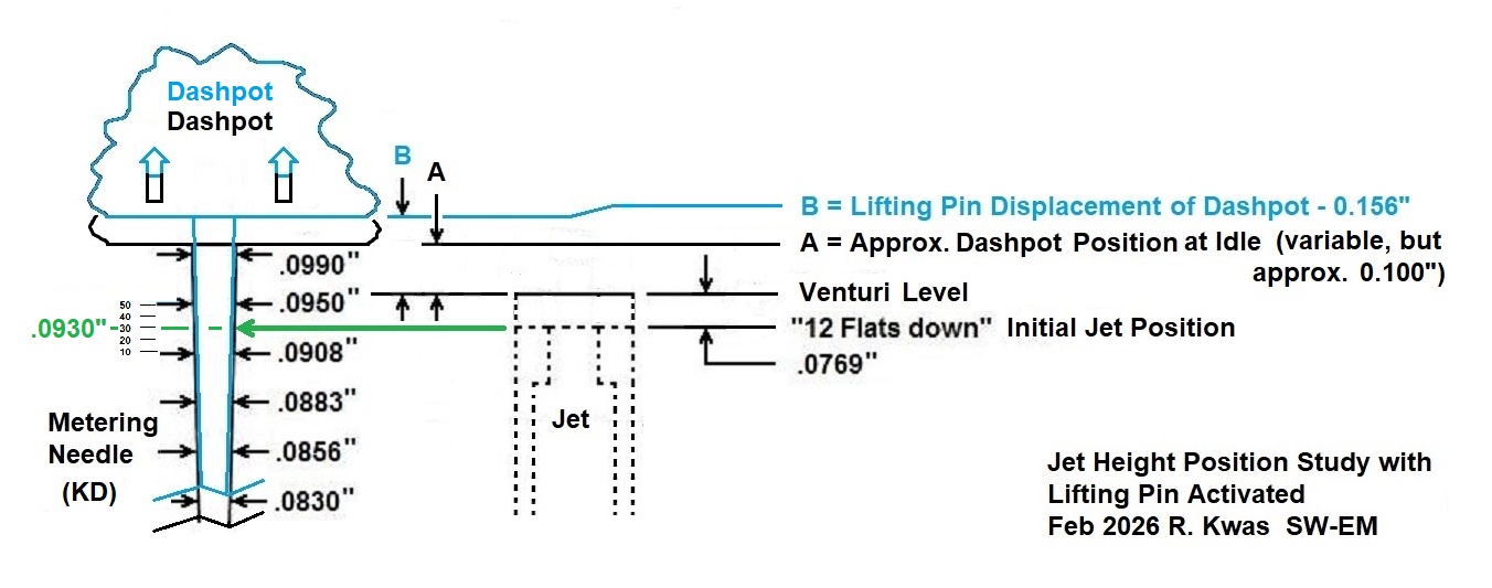 Dashpot Action during the Lifting Pin Mixture Test: During the LPMT in contrast, there is no Driver input at the Throttle...it remains unchanged from its setting, having been previously set to the Idle RPMs. The mechanic directly lifts the Dashpot a certain amount (which I have determined through careful research and measurement to be 5/32"/0.156"/4mm. This bypasses the normal, automatic/indirect manner in which it is lifted by vacuum, and manually raises the Dashpot at a known height, and in turn exposes a specific metering diameter of the Metering Needle. Presuming we start our test from the "12 Flats Down" initial mixture position, where the Jet is 0.0769" below the Venturi, and add the 0.156" LP caused rise of the Dashpot, this carb is now operating at some condition determined by the fine engineers at SU, to be the LPMT Point.