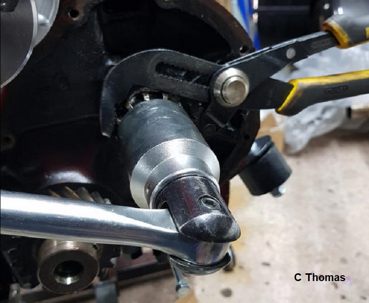 This acceptable technique for loosening the Camnut with low risk for breaking the Cam is simply holding the TG Hub unceremoniously with the biggest pair of slip-joint pliers available (also: Botchlocks, for how they are often used to "Botch things up"... but in this case, it's not really possible to botch up the TG Hub!), is best done by a two-man team, with one holding the Botchlocks for countertorque, and the other applying loosening force on the wrench (36mm / 1-7/16"). If this is unsuccessful, limited impact loosening torque can be applied to the wrench, and this should result in the desired release of the Camnut. TG Hub should then simply slip off the Camnose. If a threadlocker is known to have been used, heat will be necessary to defeat it before applying loosening torque.