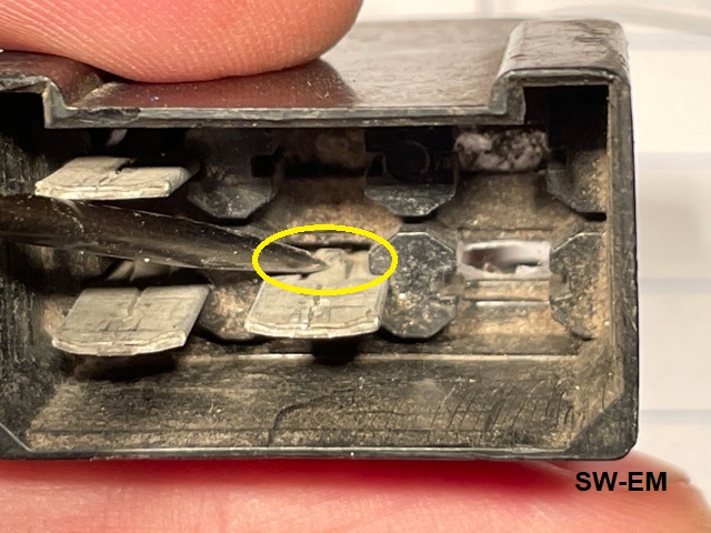 ...but beware...there are ways to get it wrong, too...in making harnesses for some of the SwEm Kits, I like the complete coverage of the fully insulated, female crimp-on contacts (...nothin' but the best for my customers!)...shown below is one of these female terminals being pushed on the male terminal of a Brake Light Switch...wrongly! It is possible to incorrectly insert these onto the mating terminal...this might make a good electrical connection today, but might become intermittent or even work its way apart tomorrow under vibration, because the mechanical connection does not have the retention force of the engaged dimple/pimple.
