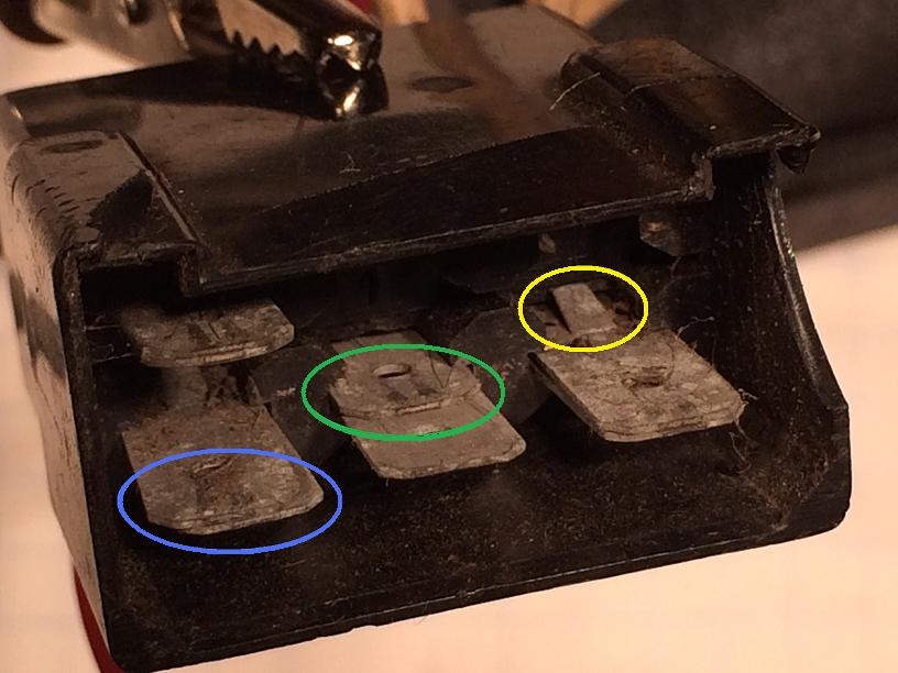All of the terminals are exhibiting gray non-conductive oxidation (Correction: Tin-oxide on the Tin plating is conductive!...aluminum oxide is the one that's NOT conductive!), and thanks to the excellent, forgiving design of the .250" terminals in general (see: Reference Information - The Lowly .250" Push-On Terminal ), where the female terminal cuts through the oxidation on the male terminal with two high pressure, spring-loaded edges (see below), as connectors are mated, normally this would not be a problem, but because the Hex-Conn uses a bifilar design at pins 4, 5, and 6, the lower male connector, facing the straight only, non-cutting side of the female terminal, is much more likely to have a poor connection because it is not subjected to a high-pressure cutting edge, but only a low-pressure flat oxidized surface of the lower corroded male terminal! The end result is that this lower terminal is likely to have a high-resistance connection to the voltage source...you can guess the rest!