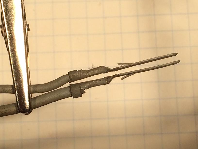 Hex-Conn Bifilar Male Terminals, removed from Housing (an up-close and personal inspection of both terminals and housing with a lupe confirms manufacturer of these components was quality US industrial connector specialist AMP):